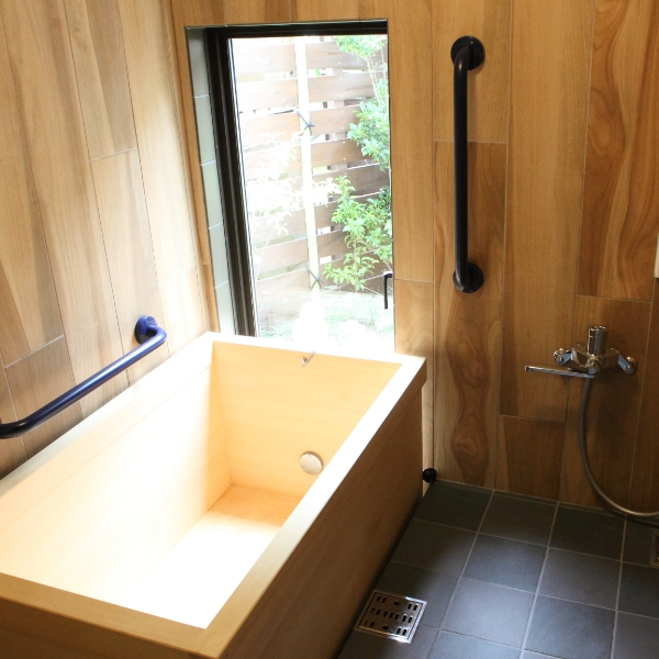 坪庭を眺めながらの檜風呂ー半日ご利用者様も利用可能です